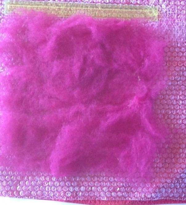 I started on a much smaller piece as I am suffering from a head cold and I was not up to any large projects today. Some of you are not familiar with felting so I thought I would do a play by play of this piece. It is 4 layers of wool in 4 different colours and is approximately 12″ x 12″. 1st layer. Is a raspberry colour, as I am in Iceland I am using Icelandic wool instead of my usual merino.