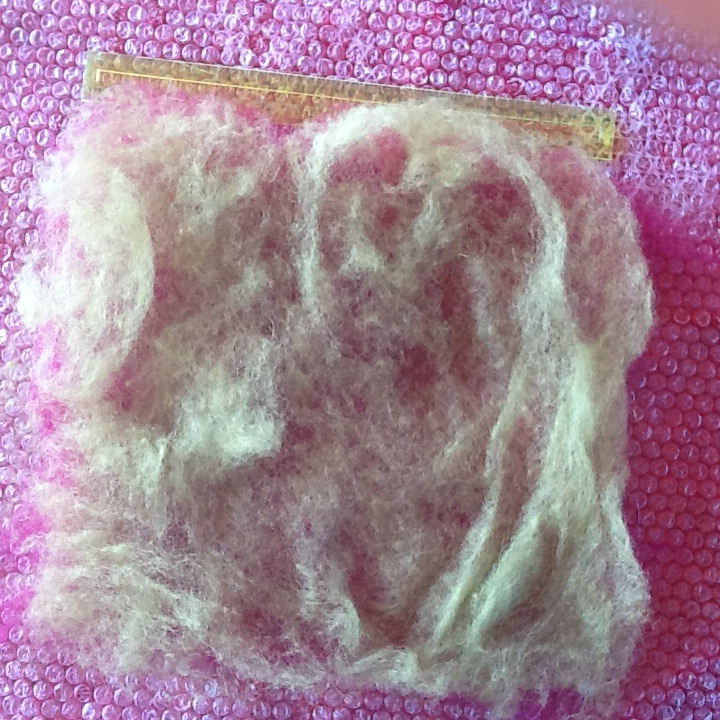 3rd and 4th layers more of the same, so now there are 4 layers of wool and I wet that out, it is laying on bubble wrap with the bubble side up, I put the bubble wrap over top as well as under the wool and rub over the surface to make sure the piece is wet through. Then I start to roll it. I wrap the bubble wrap around a pool noodle and wrap that in a towel, I am making this into a prefelt as I have more plans for it so I roll it 100 times on each side until it starts to make a very soft piece of felt.