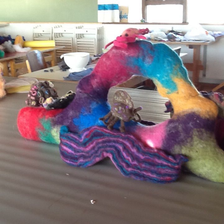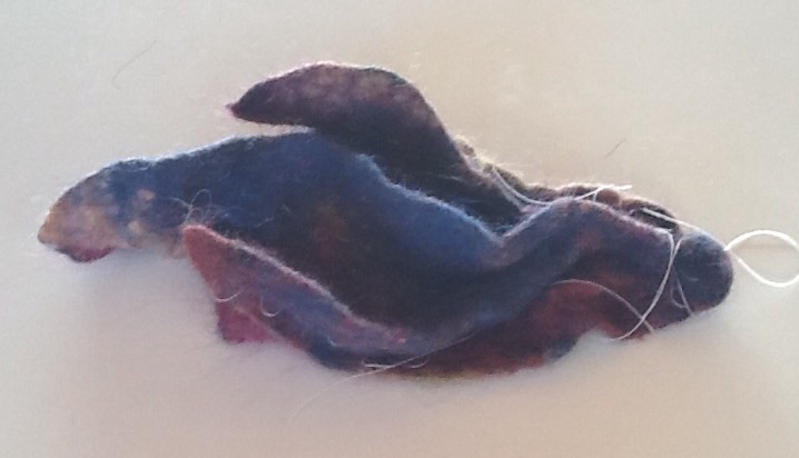 Take it out of the bubble wrap, let it dry and start to stitch it as I want to make a creature that has folds, I stitch up three sections of the felt. Wet and soap it and felt it until it is good and firm and rinse all of the soap out of it. This is what the piece now looks like, you can see some of the stitching. I will take that out tomorrow and start to cut away at the wings to show the different colours that I laid out. The piece is drying overnight.