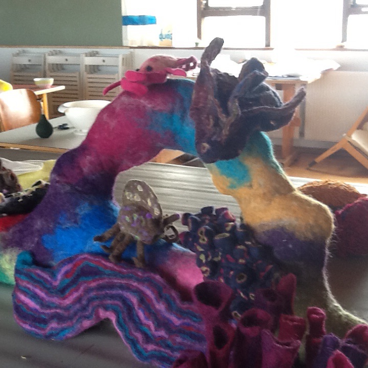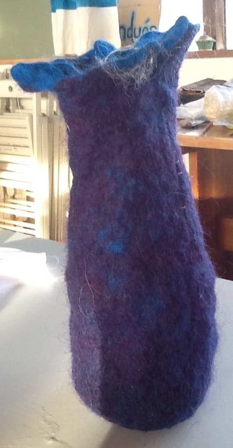 I was looking at all of the embellishments I brought from home and realized I had not used any silk hankies yet so I decided to make a coral thingy with blue and purple silk hankies with yellow roving and once I completed that one I figured one with blue roving would really show how different they look with different coloured backgrounds.