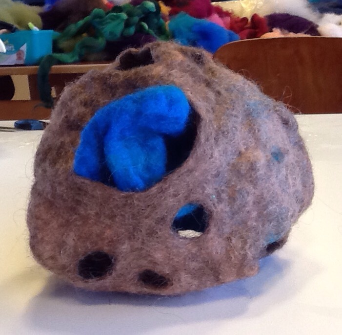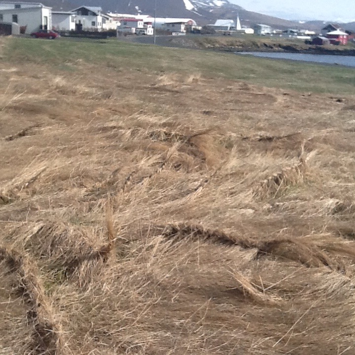 The reason behind our trip was to go to Skagastrond, our neighbouring town, that also has an artist residency NES. We arrived their in the early afternoon and introduced ourselves to all of the artists who were there, 7 of them, there are 14 artists in total. They work in an old fish processing plant in a large open area each artist having their own work table and some shelving. They have a small kitchen and are housed in 4 shared apartments around town. very different from our wake up in the morning and walk down the hall to the studio. I don’t think that kind of a residency is for me but it was fun to see what folks were working on. Some small watercolours, some larger paintings, some videos and some photography. There have been 4 artists from NES to visit us this month, one of them from Austria asked us to help her on an outdoor project she was working on braiding some grass. Off we went to braid grass, this is what it looks like so far.